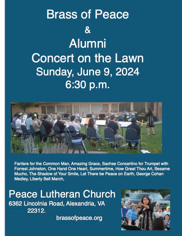 Our Outdoor Brass of Peace and Alumni Concert will be held on the usual second Sunday of June at 7 p.m. at Peace Lutheran. Rehearsals are Friday and Saturday June 8 and 9.